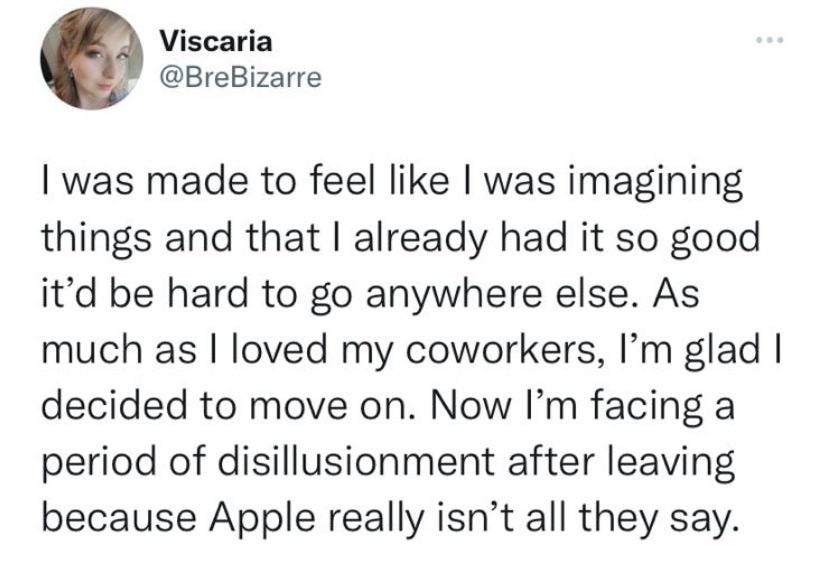 Tradução: "Me fizeram acreditar que eu estava imaginando coisas e que eu já tinha algo tão bom que seria difícil ir para qualquer outro lugar. Por mais que eu amasse os meus colegas de trabalho, eu estou feliz por ter decidido seguir em frente. Agora eu estou encarando um período de desilusão após ter saído porque a Apple realmente não é o que eles dizem ser."