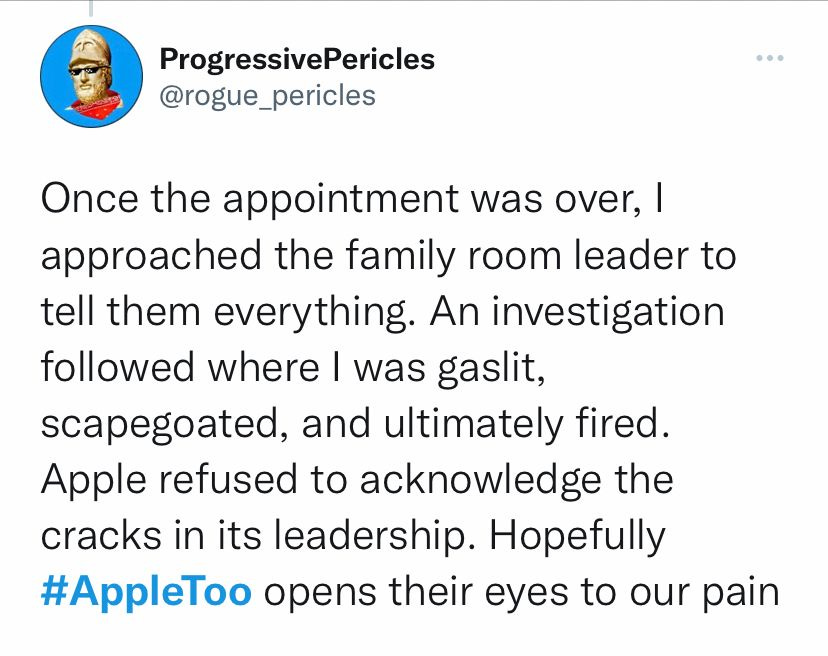Tradução: "Assim que o atendimento acabou, eu abordei o líder e contei tudo. Foi realizada uma investigação onde eu fui manipulado, usado como bode expiatório e, finalmente, demitido. Apple se recusa a reconhecer os defeitos em seus líderes. Esperançosamente #AppleToo abrirá seus olhos à nossa dor."