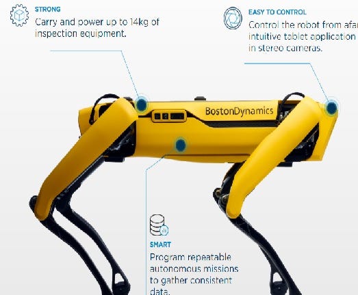“O Spot foi projetado para ir onde outros robôs não podem ir e para realizar um grande número de tarefas. O robô pode ser reconfigurado para vários casos de uso para aumentar a eficiência e reduzir significativamente os riscos de segurança no local de trabalho.”