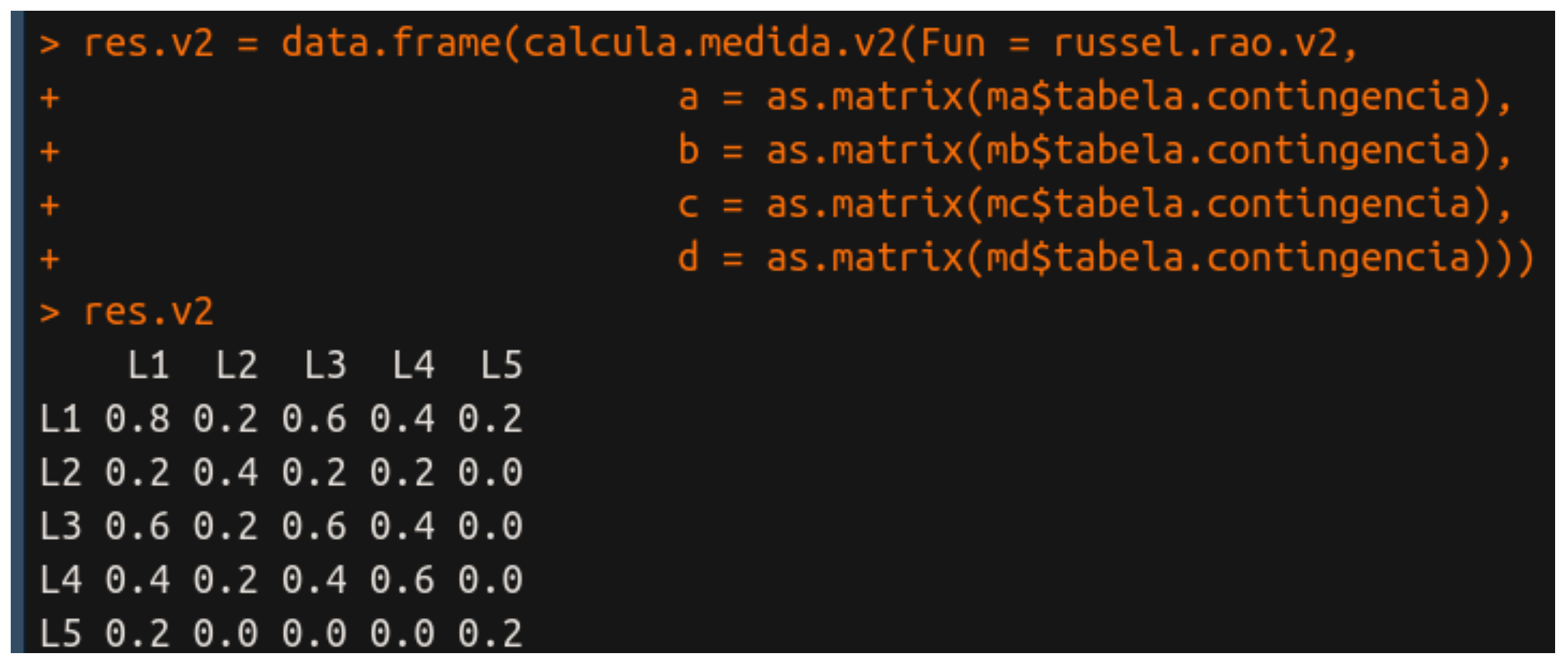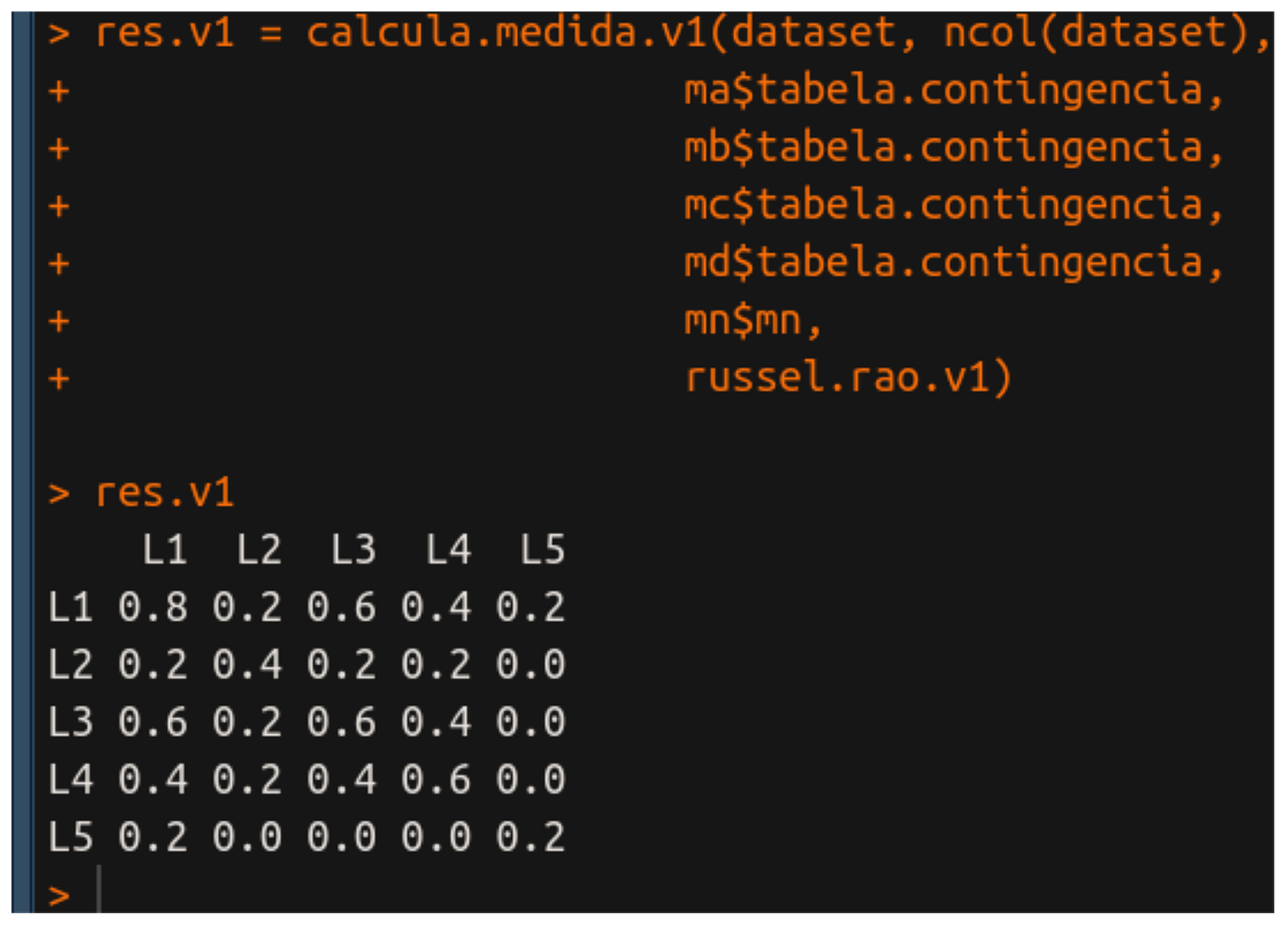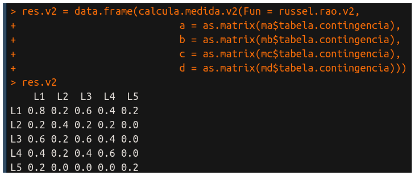 Primeiro passamos o nome da função que é russel.rao.v2 e somente depois passamos os parâmetros da tabela de contingência. A principal diferença entre essa versão e a versão 1 é que aqui estamos passando matrizes como parâmetros e elas estão sendo calculadas automaticamente por LAPPLY e APPLY. Na versão 1, a gente faz o cálculo de todas as matrizes necessárias e, portanto, a versão 2 é uma versão abstraída da versão 1.