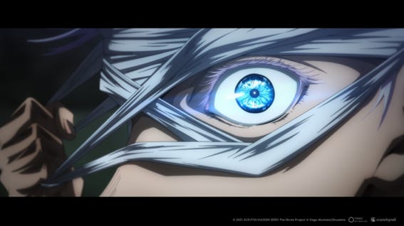 Gojou brilhando com seus olhos azuis. Penso no quanto o estúdio gasta só com esses olhos, viu? Hahaha. (Imagem: TOHO Animation/Crunchyroll)