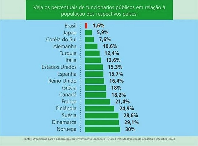 Ao observar a imagem acima, a ideia liberal mostra-se uma grande fantasia, pois o país apresenta um número muito menor de funcionários públicos em relação ao total da população quando comparado com os países que compõem a OCDE.