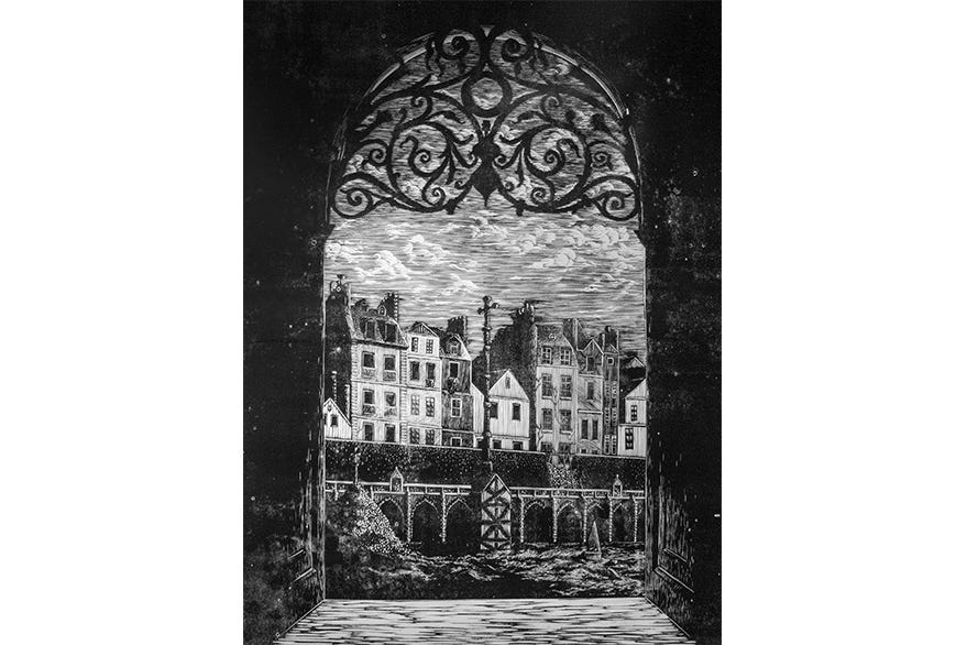 Em geral se usa tinta preta e papel branco. Por isso, o que o artista faz ao gravar a matriz é colocar luz em uma imagem que começa completamente escura. É como desenhar com giz branco em uma parede preta.