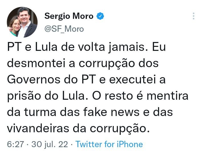 "PT e Lula de volta jamais. Eu desmontei a corrupção dos Governos do PT e executei a prisão do Lula. O resto é mentira da turma das fake news e das vivandeiras da corrupção"