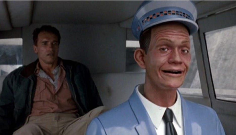 Lembra do Arnold? Aquele ator de filmes de ação, que se tornou governador da Califórnia? Tá aqui de novo. Mais uma vez, participando de um filme que antecipou tecnologias. Em O Vingador do Futuro (Total Recall, obra de 1990 baseada num livro de Philip K. Dick, mesmo autor de Blade Runner), seu personagem embarca num táxi autônomo “pilotado” pelo simpático Johny Cab, um boneco com visual retrô. Estes táxis já são realidade, através dos carros da Waymo, subsidiária do Google, em certas cidades dos Estados Unidos. Sem o bonequinho, mas igualmente gentis.